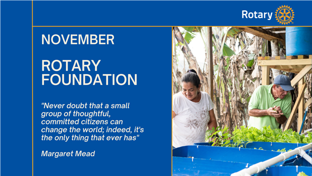 In Rotary, November is designated as Rotary Foundation Month. This month highlights the importance of The Rotary Foundation and encourages Rotarians to contribute to its various programs and initiatives. The Foundation transforms donations into projects that address global issues like poverty, illiteracy, and disease.