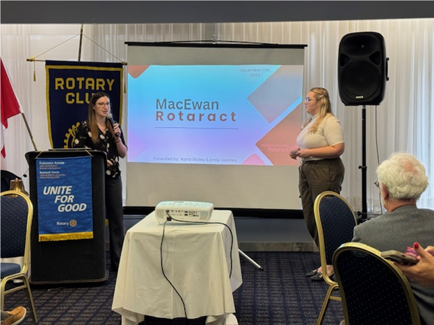 We were delighted to welcome Karra Skale, President, and Emily Geddes, Volunteer Coordinator of the MacEwan University Rotaract Club, who gave an excellent presentation at our November 17 meeting. Their club has been exceptionally active this year, demonstrating strong commitment to service and Rotary values.