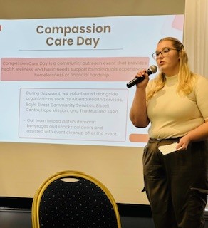 The Rotaractors volunteer regularly at the food bank and recently supported the Boyle Street Thanksgiving event, spending the day decorating, slicing pumpkin pies, and serving hot turkey meals. They also participated in Compassion Care Day, a community outreach initiative offering health, wellness, and basic-needs support to individuals experiencing homelessness and financial hardship.