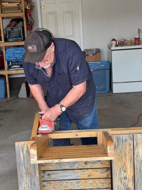 Our initial work bee to refinish the benches at the Grandview location was rained out, and the weather is still iffy. So, Al went to Grandview to pick up the benches and brought them back to his garage so they could dry out. We all met on Saturday morning (Aug 16) to get the refinishing done!